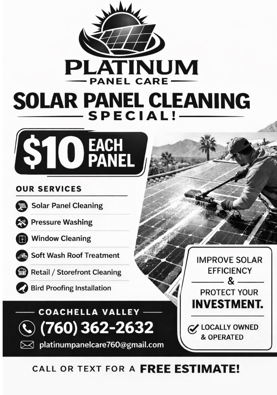 We provide reliable exterior care solutions that help homes and businesses maintain a clean, polished, and efficient appearance throughout the year in Indio, CA, and the surrounding areas. Platinum Panel Care is committed to delivering detailed service that protects surfaces, enhances curb appeal, and supports long-term property value. Our team specializes in solar panel cleaning designed to improve system performance by removing dust, debris, and buildup that can limit energy production. We use safe and effective methods that pair well with routine pressure washing to keep properties looking fresh. For roofing systems that require gentle attention, our soft wash roof cleaning process provides thorough results without harsh impact on materials. Commercial properties benefit from dependable storefront cleaning that helps create a welcoming environment for customers and clients.